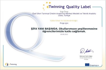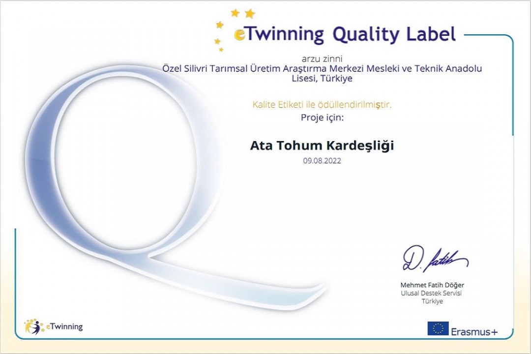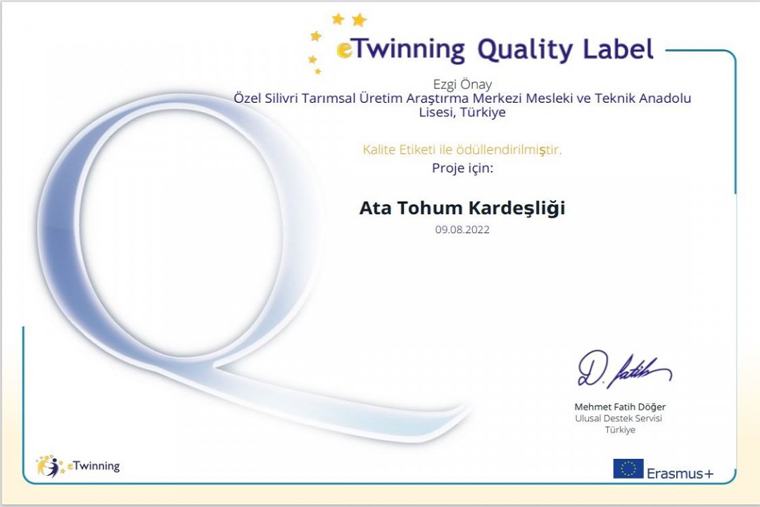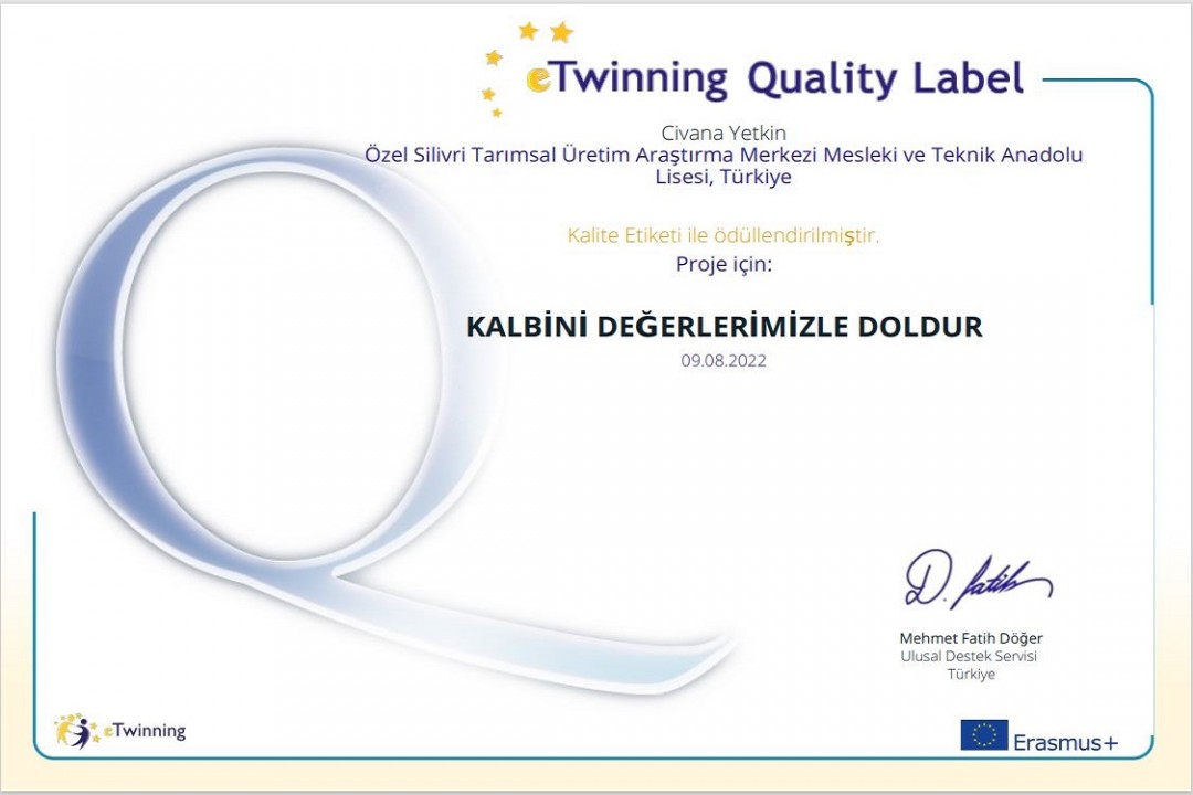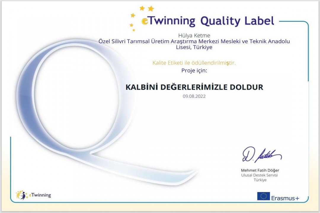 Okulumuzun Tarım alanı öğretmenleri Arzu ZİNNİ ve Ezgi ÖNAY Şifa Yanı Başımda ve Ata Tohum Kardeşliği projeleri ile, Türk Dili ve Edebiyat öğretmeni Hülya KETME ve Tarih öğretmeni Civana YETKİN Kalbini Değerlerimizle Doldur projesi ile danışmanlıklarını yaptıkları eTwinning projemiz Ulusal Kalite Ödülü almaya hak kazandılar. Emeği geçen öğretmenlerimizi ve öğrencilerimizi tebrik ediyoruz.